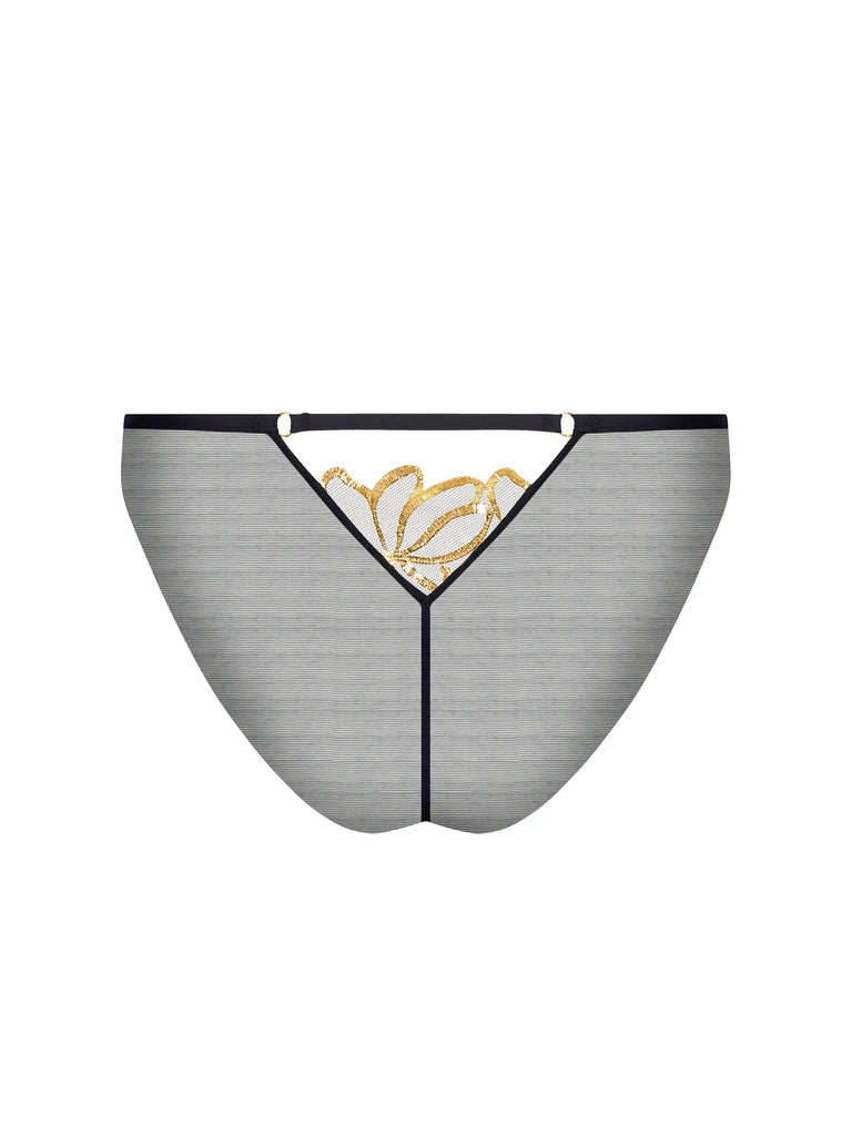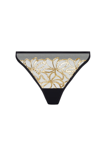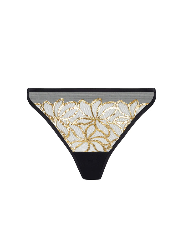 Tulle fin, broderie laminée ou encore, LISE CHARMEL a osé le sexy chic avec cette parure de lingerie, qui se pose sur la peau pour sublimer la femme. Minimaliste pour le slip italien, afin de mettre en valeur la richesse de la broderie.