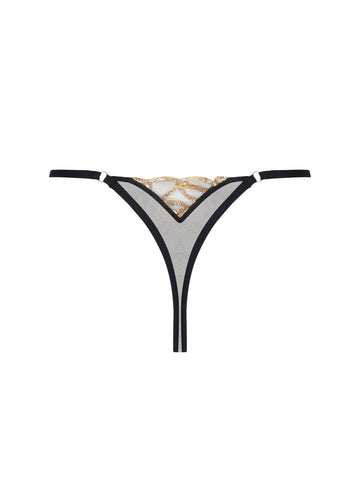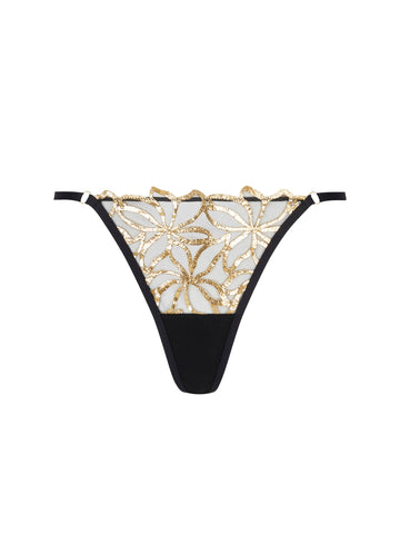 Tulle fin, broderie laminée ou encore, LISE CHARMEL a osé le sexy chic avec cette parure de lingerie, qui se pose sur la peau pour sublimer la femme. Minimaliste pour le string, afin de mettre en valeur la richesse de la broderie.
