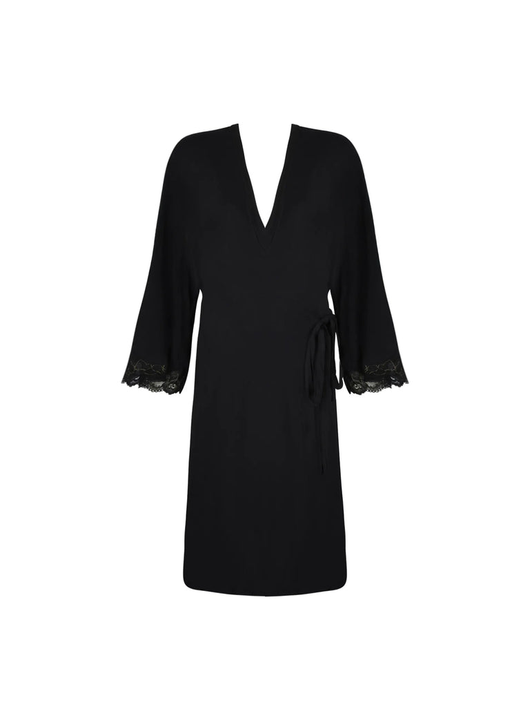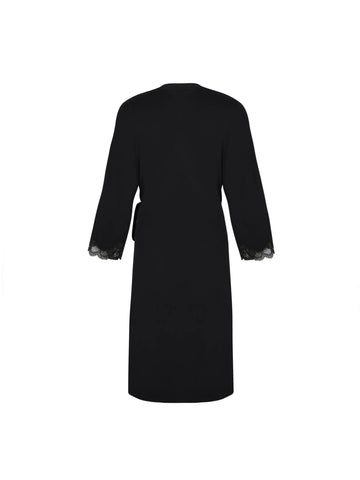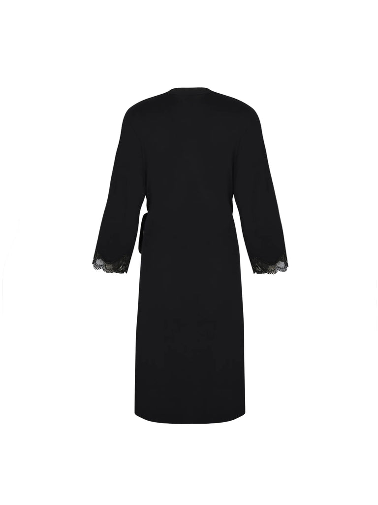 Déshabillé longueur mi-genou. Ceinture à nouer. A porter sur son ensemble de nuit.Déshabillé tout en maille de viscose de bambou. Incrustation d'un galon de dentelle sur le bas des manches. Ceinture