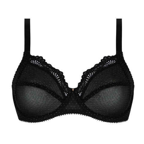 Soutien-gorge souple à armature, bonnets emboîtants en trois parties. Maintien d'exception. Porter naturel et confortable.Modèle en tulle pailleté avec incrustation d'une dentelle festonnée sur les décolletés . Bijou strassé à l'entregorge.