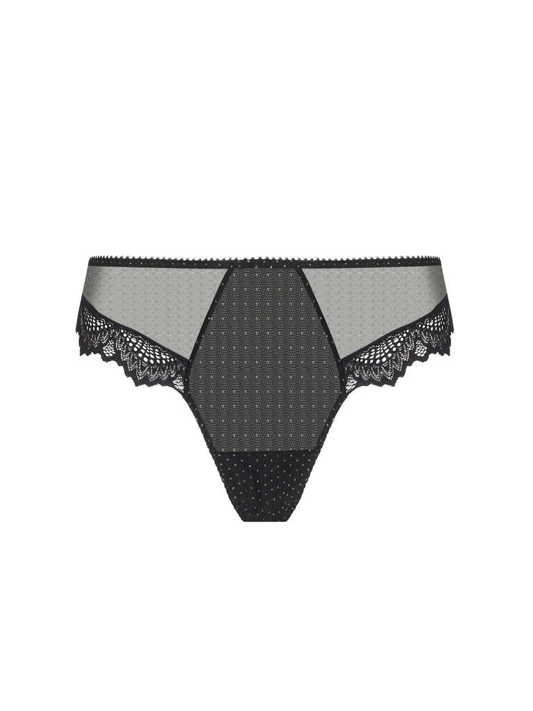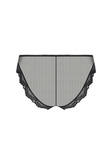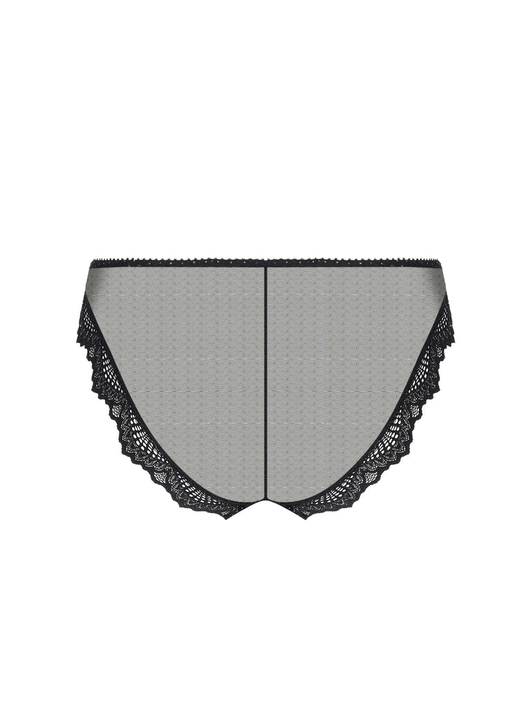 Modèle en tulle pailleté avec incrustation d'une dentelle festonnée. Le slip italien sans empiècement de tissu pour un côté esthétique et séduction.